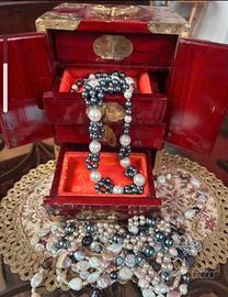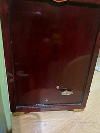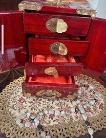 palissandro dipinto di rosso e giada (visibile su porte e laterali), con 3 cassetti con tappezzeria rossa e dorata. II portagioie è ornato di ottone.
