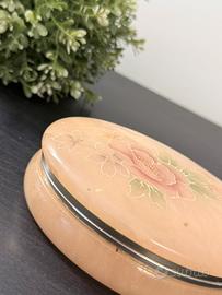 Portagioie vintage in alabastro rosa con tanto di motivo floreale sul coperchio. Le finiture e bordi dorati. È intagliata a mano e realizzata negli USA. Pezzo sopraffino, di pregiatissima qualità. 14x10x4
