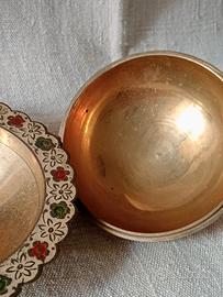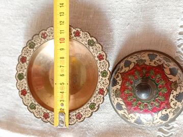 Bellissimo portagioie vintage di fattura indiana. È realizzato in ottone e presenta decorazioni dipinte a mano. Un pezzo unico per collezionisti! - Piccole dimensioni, ideale per gioielli o altri piccoli oggetti. - Colore ottone anticato con dettagli colorati. - Design elegante e raffinato.