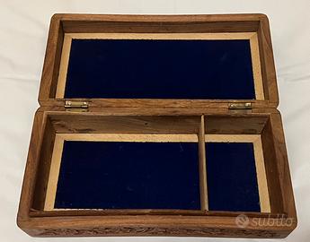 • Interni: Rivestiti in velluto blu scuro, perfetti per proteggere gioielli, orologi o piccoli ricordi. L'interno è diviso in due pratici scomparti di diverse dimensioni.