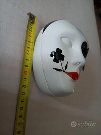 Splendido portagioie vintage in ceramica bianca smaltata a forma di maschera veneziana. Il coperchio presenta decorazioni fatte a mano: un cuore nero sull'occhio, labbra rosso fuoco che stringono un fiore e un trifoglio/quadrifoglio nero.