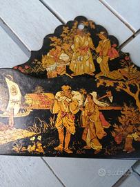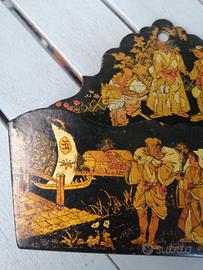 Piccolo e delizioso portalettere in cartapesta vintage, laccato in nero, con immagini orientaleggianti.