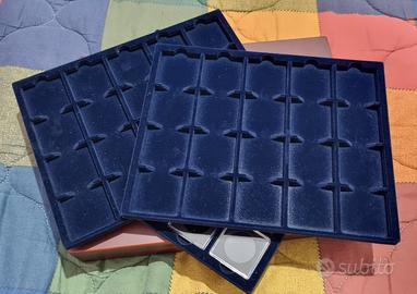 Portamonete in plastica e velluto marca Leuchtturm con 3 ripiani da 20 monete cadauno più 20 blister in plastica per conservare le monete.
