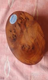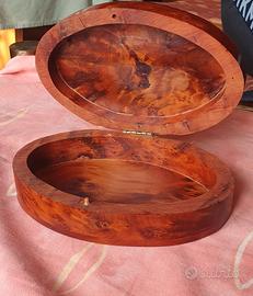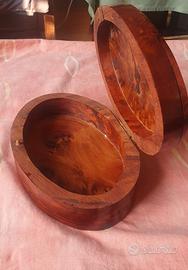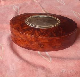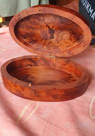 Portaoggetti decorativo, produzione artigianale anni 60/80. Italia Cofanetto in Radica di noce o olmo, con venature decorative. Cartiglio ovale centrale in metallo (ottone o alpacca). dim. cm 19 x 13 x 5.5h peso gr. 446