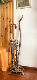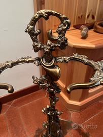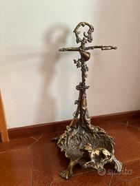 Il supporto rappresenta un albero con i suoi rami e foglie in mezzo alla vegetazione e ai fiori. Sotto il manico c'è un corno da caccia e un fucile appoggiato all'albero. Una selezione di selvaggina è adagiata verso il fondo del vassoio e la scena è completata da un cane da caccia in riposo. Il supporto è sostenuto da terra da quattro piedini a forma di foglia. Realizzato in ottone massiccio di buona qualità con un buon peso che anche mettendo un solo ombrello non si sbilancia.