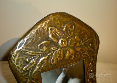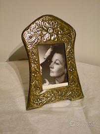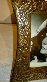 Cornice portafotografia rivestita in lamierino di ottone sbalzato , di gusto liberty. Autentico d'epoca, Francia, millenovecento