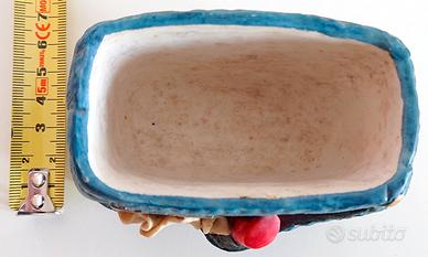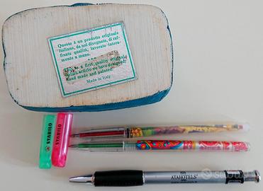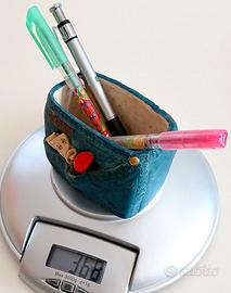 Portapenne fatto a mano nel 1990 da Ennio Morcaldo e Emilio Casarotto - made in Italy Oggetto artigianale, lavorato con finitura esterna stile Jeans - arte - oggettistica Peso 368 grammi Dimensioni: circa 9 x 6 x 7 cm Regalo le tre biro che si vedono in foto: quella nera e quella rossa Stabilo sono secche (scrivono male), mentre quella verde Stabilo è utilizzabile Ritiro a Valenza (AL) oppure spedizione