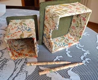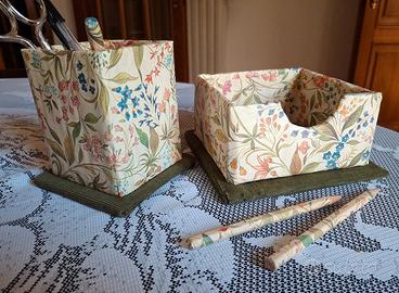 Due oggetti per abbellire la tua scrivania con stile: portapenne e portafogli per appunti. Oggetti vintage in cartone pesante originali rivestiti con carta fiorita classica e base rivestita con stoffa di velluto verde. Misure della base 14,5 cm x 14,5 cm per il portafogli e 9,5 cm x 9,5 cm per il portapenne, altezza rispettivamente 7 cm e 10 cm. In omaggio 3 lapis rivestiti con la stessa carta come da foto.