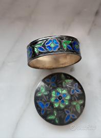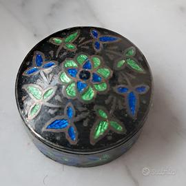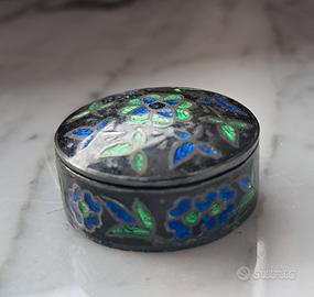 portapillole antico in argento 925 e ornato con disegno floreale smaltato sia il coperchio che la circonferenza.