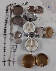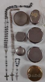 10 oggetti in lotto a euro 60,00 non trattabili. di seconda mano con normali segni del tempo e uso, ma in buono stato. il portapillole con farfalla in ottimo stato e sempre tenuto in vetrina. - porta rosario anni 50 in metallo argentato (penso sia argento, ma non ci sono punzonature forse consumate dall'usura). raffigurata santa teresa del b.no gesu'. la chiusura e' lenta. ciondolo che si puo' appendere a una collana. nessuno di questi tre rosari puo' andare bene. Ø cm3,5 euro 15,00 - scatolina rotonda con lavorazione in punzonatura di fiore grande e piccoli su coperchio, punzonatura anche sotto, metallo argentato. Øcm.5 - h.cm0,9 euro 7,00 - scatolina di forma esagonale, metallo argentato. cm4xcm3,5xh.cm1,2 euro 5,00 - scatolina in ottone. sotto c'e' punzonatura con simbolo ape e iniziali G.G., MADE IN ITALY. Ø coperchio cm5/ scatola cm5,8 euro 8,00 - due portapillole giornaliero, da borsetta o tasca, tre scomparti, in metallo argentato. uno ha come immagine delle rose, l'altro delle peonie con farfalla. Ø interno cm5/ Ø eserno cm6/ h.cm2 circa euro 5,00 cadauno. - un portapillole giornaliero, scomparto unico, metallo argentato e ceramica con immagine di dama fra i fiori. misure interne cm4xcm2,7/ esterne cm5,5xcm4/ h.cm2 circa euro 5,00 - tre rosari: uno lungo con perle sfacettate nere, cm39 euro 8,00 uno piccolo perle sfacettate nere, cm10 euro 5,00 uno lungo perle in metallo, cm31,5 euro 8,00. preferibile ritiro a mano, eventuale spedizione con corriere.