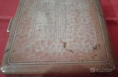 Splendido e molto raro portasigarette del periodo fascista. Realizzato in lamina di bronzo argentato, reca al dritto la testa di Benito Mussolini, duce del fascismo, con elmetto, questa caratteristica lo fa datare pertanto al periodo 1935-1943. Al rovescio reca incisa lo stemma del PNF (Partito Nazionale Fascista) e TORINO XVII (probabilmente il numero si riferisce all’anno fascista quindi al 1938-1939. L’interno, in vermeil dorato, reca ancora i due elastici atti a contenere le sigarette. Al lotto compete anche una fotografia d’epoca (dimensioni 14x9 mm)che ritrae quattro nostri militari in divisa (probabilmente uno di essi era il proprietario del portasigarette), sul retro della foto è scritto che il milite apparteneva al 3° Reggimento Fanteria "PIEMONTE", 3° Battaglione, 8a Compagnia corredato dal suo nome e cognome che per privacy non divulgo. Questo reparto parteciperà alla Guerra di Etiopia ed alla Campagna di Grecia. Si presenta ancora in buonissime condizioni con patina d’epoca ed ha dimensioni 8x7mm. Il dispositivo di chiusura è perfettamente funzionante. Un cimelio d’epoca per gli appassionati collezionisti del ventennio. Vendita ai soli fini storici e collezionistici. Pagamenti: Bonifico Bancario, paypal verso amici e altri sistemi postali.