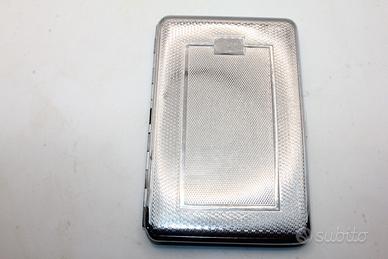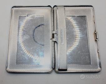 Questo portasigarette vintage di raffinata manifattura inglese a marchio Kincraft rappresenta un eccellente esempio di accessorio maschile in stile Art Déco realizzato in metallo con finitura EPNS. L'esterno dell'oggetto è impreziosito da una fitta lavorazione guilloché a piccoli rombi che riveste quasi interamente le superfici, interrotta solo da una cornice rettangolare liscia e da un cartiglio superiore destinato all'incisione di iniziali personalizzate.