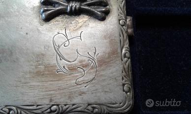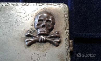 Particolare portasigarette del periodo della Prima Guerra Mondiale e la Repubblica tedesca di Weimar di un appartenente ad un FREIKORPS e precisamente di un battaglione di Ussari (Braunschweig IR92 Husaren Regiment 17) come si può notare dalla presenza in alto a destra del noto simbolo TOTENKOPF ovvero "testa di morto" (un teschio che sormonta due tibie annodate in basso) tipico anche dei pirati (c.d. Jolly Roger) e in seguito delle famigerate WAFFEN SS. I Freikorps erano delle milizie paramilitari di ispirazione nazionalistica che combattevano apertamente le fazioni bolsceviche attive in Germania che poi confluiranno nelle SA e SS della Germania nazista. Il portasigarette, realizzato in alpacca, ha dimensioni 10 cm x 7,5 cm x 1 cm circa e reca al dritto in alto a destra il simbolo, in rilievo, del totenkopf, mentre i n basso a destra su presenti, incise, due lettere in nesso G e S, probabilmente le iniziali del proprietario. Il sistema di apertura e chiusura è perfettamente funzionante, all'interno è presente la marcatura "ALPACC" e "GES.GESCH." (prodotto legalmente). L'alpacca (detta anche argentone o argento tedesco) è una famiglia di leghe rame-zinco-nichel, con rame al 50-60%, zinco al 15-30% e nichel al 10-30%, aventi buone caratteristiche meccaniche e di resistenza alla corrosione. La presenza del nichel migliora tali caratteristiche e conferisce alla lega un aspetto molto simile a quello dell'argento. Un tempo usata per la produzione di posate, è oggi apprezzata nella costruzione di piccole parti meccaniche. Si tratta di un cimelio dal alto valore storico nonché di pregevole fattura. Tutto "rigorosamente" originale d'epoca al 100% e garantito. Spedizione: Pacco Celere 3 (10 euro); Metodi di Pagamento: Bonifico Bancario. Vaglia Postale, Paypal, altri sistemi postali, contrassegno. Diritto di Recesso entro 10 giorni. Con dichiarazione di autenticità.