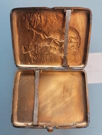 Importante porta sigari da collezione in argento finemente decorato a sbalzo, cesello e incisioni. La chiusura è impreziosita da un cabochon di agata gialla e l'interno del portasigarette è in vermeil. Punzoni, Russia, XIX secolo.