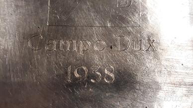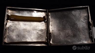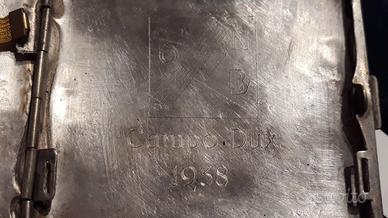 Splendido portasigarette fabbricato in epoca fascista in alpacca, ha dimensioni 8,5 cm x 7, 5 cm. Reca sul davanti un cartiglio ove sono incise le sigle del proprietario D.d.F. e un piccolo emblema floreale. Al suo interno vi è inciso l'emblema della ONB e la scritta CAMPO DUX 1938. L'Opera nazionale Balilla per l'assistenza e per l'educazione fisica e morale della gioventù (nome esteso, nota come Opera nazionale Balilla, in sigla ONB) fu un'organizzazione giovanile del Regno d'Italia, istituita nel 1926, durante il ventennio fascista, poi soppressa e confluita nella Gioventù italiana del Littorio (GIL), a partire dal 1937. La denominazione fu ispirata alla figura di Giovan Battista Perasso, detto "Balilla", il giovane genovese che secondo la tradizione avrebbe dato inizio alla rivolta contro gli occupanti austriaci nel 1746: un'immagine di patriota sfruttata quindi dal regime fascista. Evidentemente la scritta è stata aggiunta in seguito alla soppressione dell'ONB e reca l'inusuale presenza della lettera U rispetto alla classica V. Il portasigarette si presenta ancora in ottimali condizioni e reca ancora gli elastici interni e il sistema di chiusura è perfettamente funzionante, inoltre è marcato ALPACCA. Il pagamento per l'acquisto dell'oggetto, potrà essere effettuato a scelta del compratore tramite i seguenti sistemi: bonifico bancario, ricarica delle poste, paypal . Spedizione 10 euro (pacco tracciato delivery). Diritto di recesso entro 10 giorni. Su richiesta dichiarazione di autenticità.