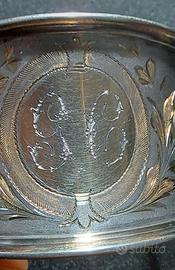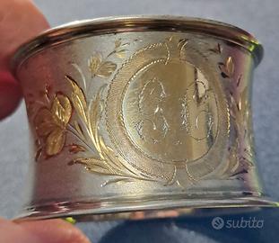 Antico portatovagliolo recante le iniziali "G e C" e risalente ai primi '900. Pur non essendoci punzonatura (peraltro non obbligatoria a quei tempi), penso sia in in argento, con intarsi in oro, anche se non ne ho la certezza. E' sicuramente un articolo unico, poiché fatto a mano da qualche artigiano del periodo.