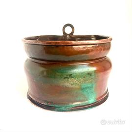Affascinante per la sua patina questo antico contenitore fatto a mano in rame antico era originariamente impiegato vicino ai camini, oggi è un pezzo decorativo ideale per piante o fiori in balcone o in giardino.