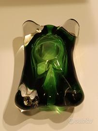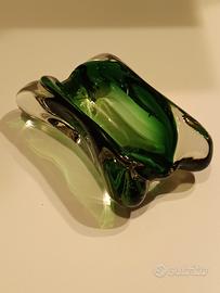 Posa cenere/ ciotola/ svuota tasche in vetro all' uranio di murano sommerso, vari strati di vetro verde smeraldo, con varie sfumature,epoca anni 60, attribuito a Flavio Poli, misura lunghezza 17cm.. diametro 10 cm.. altezza 6 cm...in perfetto stato!!