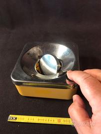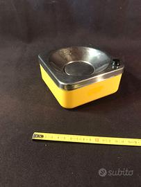 Posacenere vintage anni settanta quadrato in plastica dura gialla e acciaio con bottone a pressione con ribalta centrale, produzione Valenti Milano mod inox Design Gaetano Scolari made in Italy. In perfetto stato come da foto misure generali cm. 14x14x6,5.