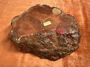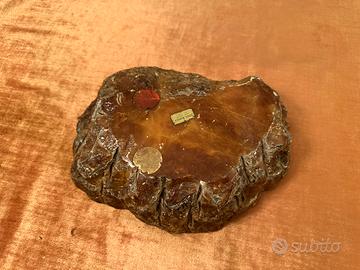 Elegante posacenere scolpito a mano in alabastro autentico, realizzato in Italia (etichetta originale sul fondo: “Genuine Alabaster – Hand Carved – Made in Italy”). Il colore naturale bruno con sfumature ambra e la forma grezza lo rendono un pezzo unico e decorativo, perfetto per ambienti vintage, collezionisti o come elemento d’arredo.