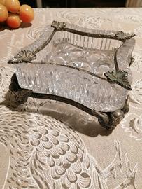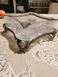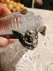 Vendo posacenere in cristallo e con bordi con foglie e angioletti in metallo argentato, tipo silver plated, cm. 14x14, altezza cm. 7, ottime condizioni, spedizione in tutta Italia