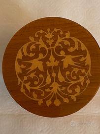 Scatola legno intarsiato "Inlaid Italian Wooden Works" s.n.c. Surriento Sorrento-Italy". Interno velluto rosso e specchio.