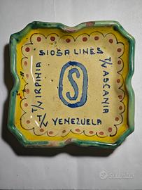 Posacenere pubblicitario anni '50 Transatlantico Irpinia Ascania Venezuela - Compagnia di Navigazione Grimaldi Siosa Napoli - Ceramica 95x95mm - buone condizioni generali, qualche piccolo segno di uso e del tempo. RARO.