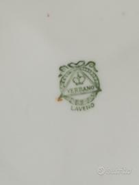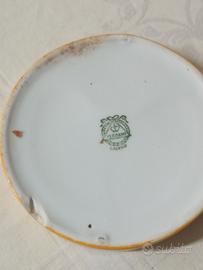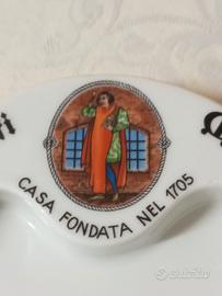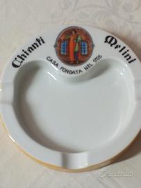Posacenere con scritta Chianti Melini casa fondata nel 1705. anni 50. Illustra il tradizionale logo storico con una figura in abiti d'epoca , del marchio di fabbrica Verbano S.C.I. Laveno porcellana di alta qualità
