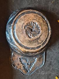 L’oggetto presenta una lavorazione a sbalzo e cesello con motivi decorativi classici, tipici dell’argenteria italiana d’epoca.