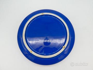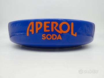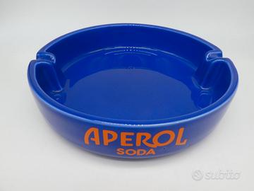 Il posacenere è in ceramica smaltata blu con scritta arancione Aperol Soda in rilievo, dal diametro generoso di 25 cm. È in condizioni perfette, senza scheggiature né crepe.