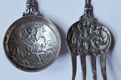 Coppia di posate antiche placcate argento fine ottocento con sbalzi e disegni, ciascuna posata ha il manico con una pietra naturale di Lapislazzuli incastonata e una scultura. Lavorazione artigianale nei minimi dettagli. Lunghezza 23 cm circa. Per ulteriori dettagli contattare. Spedisco.