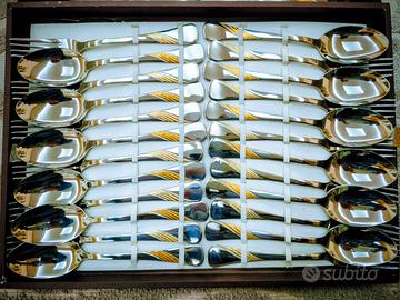 In vendita un elegante e completo servizio di posate del rinomato marchio italiano Inoxpran. Questo set comprende 75 pezzi, realizzati in pregiato acciaio inossidabile 18/10 con purissimo oro zecchino 24 kt; tutto è contenuto in un'elegante valigetta e corredato dal certificato di garanzia e autenticità.
