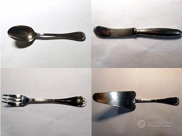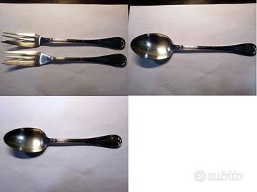 RUBANS POSATE VINTAGE CHRISTOFLE, SILVER PLATED FORCHETTA, CUCCHIAIO, COLTELLO Posate prodotte negli anni '70, usate; vedere specifiche condizioni nella descrizione; i manici dei coltelli recano segni d'uso e lievi ammaccature. CUCCHIAI "table spoon" (B) - 205 mm. - buone condizioni - ESAURITO "table spoon" (D) - 205 mm. - discrete condizioni - pz. 9 - € 9,00 cad. "coffee spoon" - 136 mm. - buone condizioni - ESAURITO FORCHETTE "dinner fork" - 205 mm. - buone condizioni - pz. 25 - € 16,00 cad. "dessert fork" - 170 mm. - buone condizioni - pz. 18 - € 14,00 cad. "cake fork" - 159 mm. - ottime condizioni - pz. 12 - € 21,00 cad. COLTELLI "dinner knife" - 245 mm. - discrete condizioni - ESAURITO "dessert knife" - 195 mm. - discrete condizioni - ESAURITO "butter knife" - 165 mm. - discrete condizioni - ESAURITO "cheese knife" - 205 mm. - discrete condizioni - ESAURITO PEZZI A SERVIRE - SERVING PIECES "serving fork" - 245 / 250 mm. - buone condizioni - pz. 1 / 1 - € 44,00 cad. "salad serving fork" - 245 mm. - buone condizioni - pz. 1 - € 44,00 cad. "serving spoon" - 250 mm. - buone condizioni - pz. 2 - € 44,00 cad. "salad serving spoon" - 245 mm. - buone condizioni - pz. 1 - € 44,00 cad. "cake server" - 250 mm. - buone condizioni - pz. 1 - € 44,00 cad. "gravy ladle" - 178 mm. - buone condizioni - ESAURITO Posate prodotte negli anni '70. Altri tagli: ESAURITI Esaminare le foto per rendersi conto delle condizioni delle posate. Se la quantità disponibile è maggiore di 1, la foto è rappresentativa di più esemplari in condizioni omogenee. A richiesta, fornisco foto dei singoli pezzi. Le posate recano segni d'uso ed i manici dei coltelli presentano lievi ammaccature. Gli esemplari appartengono alla mia collezione privata