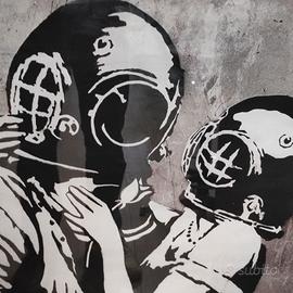 Grafica iconica su originale Banksy con figure in stile stencil raffiguranti due soggetti con casco da palombaro, fondo grigio materico e grande scritta “Blur” in rosso.