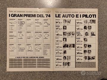 Poster Ferrari anni 70 Regazzoni, Niki Lauda, 1974 con circuiti formula uno auto e piloti sul retro.