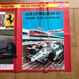 Collezione Poster Gran Premi 1984 Autosprint. F1 / 29 aprile 1984, GP Belgio-Zolder: la prima vittoria di Alboreto in Ferrari, un giorno dopo la sua prima pole in F1. In buone condizioni, con piegature e buchini della pinzatura al giornale. Misure: 81 x 53