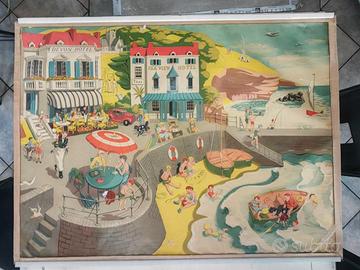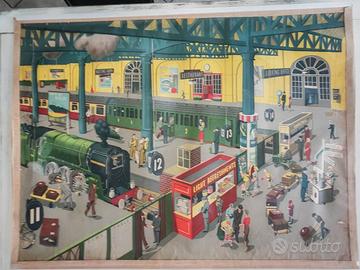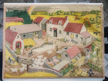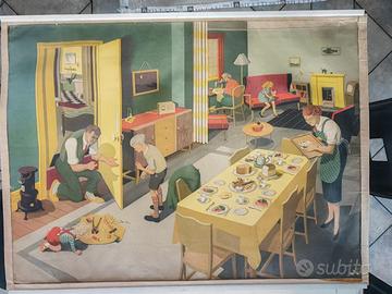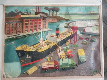 RARISSIMO SET 6 POSTER DIDATTICI ORIGINALI BRITANNICI - ANNI '50 Serie completa "General Service English Wall Pictures" Artista illustratrice: Elizabeth Skilton Editore: Longmans, Green & Co. Ltd. - Londra Stampatore: Lowe & Brydone Ltd. - London Commissionati dal British Council negli anni '50 per l'insegnamento della lingua inglese nelle scuole. Ogni tavola rappresenta una scena di vita quotidiana britannica. Oggi sono pezzi di modernariato estremamente rari e ricercati da collezionisti, appassionati di illustrazione vintage e interior designer. VALORI DI MERCATO: set completo battuto fino a 2.000 GBP in aste internazionali. I 6 SOGGETTI INCLUSI NEL LOTTO: 1. Train Station - Stazione ferroviaria 2. Harbor and Industry - Porto industriale 3. Beach Holidays - Vacanze al mare 4. Farm - La fattoria 5. Country Life - Vita di campagna 6. Living Room and Family - Interno domestico SCHEDA TECNICA: - Tecnica: cromolitografia su supporto telato - Supporto: tela tipo lino con stecche in legno - Dimensioni: circa 100 x 75 cm cadauno - Epoca di produzione: 1955-1960 - Originali d'epoca, NON ristampe CONDIZIONI: buono stato generale. Colori ancora vividi. Leggeri segni del tempo ai bordi che ne certificano l'autenticita'. Disponibili foto ravvicinate di ogni pezzo. PREZZI: - Set 6 pz: 800euro Consegna mano Biella /provincia. Spedizione tubo rigido (spese acquirente).