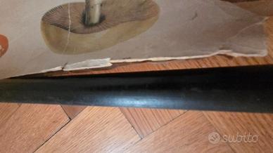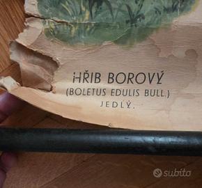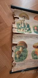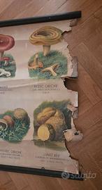 Poster didattico vintage sui funghi, con nomi scientifici e classificazione (commestibili e velenosi). Grafica molto interessante e decorativa, tipica delle tavole scolastiche di metà secolo. Originale, completo di aste in legno nere. Condizioni: Presenta molti segni del tempo: strappi, parti mancanti sui bordi, pieghe e usura diffusa (vedi foto). Da considerare come pezzo da restaurare. Presente sul retro il marchio del produttore e logo originale, dettaglio importante per autenticità e collezionismo. Il soggetto è molto ricercato. Con restauro o incorniciatura può diventare un elemento decorativo di grande impatto. Perfetto per appassionati di botanica, arredamento vintage, studi o ambienti rustici.