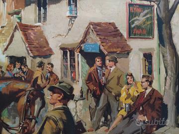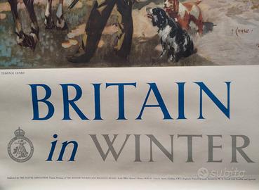 Britain in Winter, Poster Vintage anno 1948, cm. 75,6 x 50,5, Stato:buono, Piccole mende ai lati, increspature marginali. . Autore: Terence Cuneo (1907-1966),un prolifico pittore e illustratore inglese noto per le sue scene di ferrovie, cavalli e azioni militari. Fu anche l'artista ufficiale per l'incoronazione della regina Elisabetta II nel 1953 raffigura una scena di caccia con uomini a cavallo e a piedi con i loro cani. Altri si riposano in un pub con una birra calda dopo un giro in bicicletta. Pubblicato dalla Travel Association of Great Britain and Northern Ireland, creata nel 1928 per aumentare il numero dei turisti in Gran Bretagna ed Irlanda del Nord e stampato in Gran Bretagna da WSCowell Ltd. London & Ipswich, il cui logo è riprodotto in basso a sinistra.