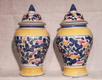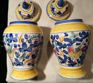 Due belle potiches dipinte a mano con uccelli e fiori, area Italia meridionale, altezza cm 21 ca. Ottime condizioni, posso spedire