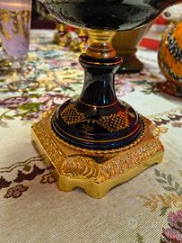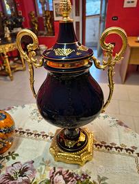 Perfettamente integra, con ancora il cartellino attaccato. Anni 80. porcellana blu cobalto con decorazioni in oro zecchino, rifiniture in bronzo dorato