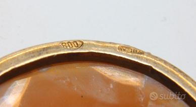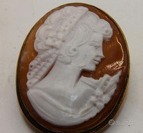 Questo pregevole cammeo antico si distingue per la straordinaria qualità dell'incisione su conchiglia, che ritrae un profilo femminile di squisita fattura classica incorniciato da una raffinata montatura in argento titolo 800. Il gioiello vanta dimensioni generose di 43 x 32 mm e presenta una lavorazione artigianale meticolosa, evidente soprattutto nei dettagli dei capelli adornati e nel panneggio della veste che conferiscono al soggetto una profondità quasi scultorea. La montatura è impreziosita da una sottile bordura a cordoncino che ne esalta l'eleganza senza tempo, mentre il retro rivela l'autenticità del manufatto grazie alla presenza dei punzoni di stato, tra cui quello del titolo dell'argento 800 e il marchio identificativo del produttore. Progettato per essere estremamente versatile, questo pezzo può essere indossato con la stessa eleganza sia come spilla, grazie all'ago posteriore ben conservato, sia come ciondolo mediante l'apposito occhiello a scomparsa. La calda colorazione della conchiglia sardonica e la delicata patina metallica rendono questo cammeo un accessorio di grande fascino storico, ideale per chi ricerca un oggetto da collezione capace di unire l'arte incisoria alla praticità di un gioiello moderno.