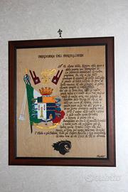 RAFFIGURANTE STEMMA ARALDICO ,FREGIO E MOSTRINE REGGIMENTI BERSAGLIERI SU TRICOLORE E PREGHIERA DEL BERSAGLIERE SCRITTA INTERAMENTE A MANO.