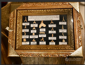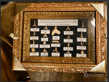 Causa trasloco SVENDO: PREGIATA e RARA collezione incorniciata di fossili, principalmente denti di squalo e ossa di rettili provenienti dai giacimenti di fosfati del Marocco. I Fossili risalgono a un'età stimata tra i 45 e i 70 milioni di anni. La collezione include denti di vari generi di squali come Odontaspis, Lamna, Corax e Myliobatis. Sono presenti anche resti di rettili specificamente vertebre e denti di Mosasaurus e Onchosaurus. CONDIZIONI: conservato in ottimo stato il tutto incorniciato su quadro ricoperto in foglia d'oro con vetro.