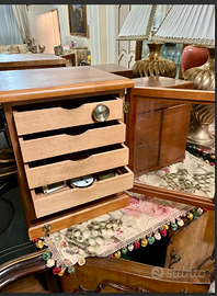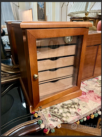 PREGIATA e ESCLUSIVA sala da fumo HUMIDOR da banco con pannelli in vetro per sigari. Progettato per conservare i sigari, l'interno è rivestito in legno di cedro spagnolo che aiuta a mantenere un clima costante e a proteggere dai parassiti del tabacco. Include un igrometro integrato per monitorare il livello di umidità e un umidificatore per preservare l'aroma e la freschezza dei sigari. Dotato di 4 cassetti estraibili e l'ultimo fisso con scanalature di ventilazione per garantire una circolazione ottimale dell'aria all'interno. CONDIZIONI: praticamente nuovo da vagliare quale IDEAREGALO per appassionati.