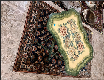 RICERCATO e RAFFINATO tavolino da tè/caffè a VASSOIO RIPIEGHEVOLE, prodotto da FLORENCE made in Italy. Realizzato in metallo smaltato decorato a mano con motivo floreale e una finitura tinta verde e crema. Bordi sagomati e finitura invecchiata. Vintage/Antico riconducibile anni '50. CONDIZIONI: ottimo stato conservativo ma essendo un articolo antico/vintage può presentare i lievi segni del tempo che ne attestano l'originalità e il fascino.