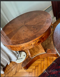 ESCLUSIVO e RARO tavolo rotondo con 3 cassetti a scomparsa in stile IMPERO, antico risalente meta del XIX Secolo realizzato in radica di noce. CONDIZIONI: buono stato conservativo ma essendo un articolo ANTICO/VINTAGE può presentare alcuni segni di normali usure commensurate all'epoca e all'uso nel tempo, da COLLEZIONE. CONTESTUALIZZAZIONE ideale VILLA d'EPOCA/DIMORA STORICA, CHALET/BAITA montagna, RELAIS di campagna. MISURE: diametro80xh81cm c.a. VISIBILE e RITIRABILE zona Treviso