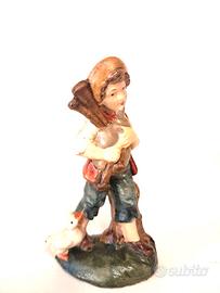 Stupenda statua raffigurante pastore giovane che suona la cornamusa ed oca ai piedi, realizzata interamente in Italia in cartapesta, dipinta a mano ed adatta a presepi con statue di altezza 10 cm.
