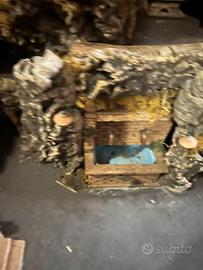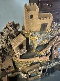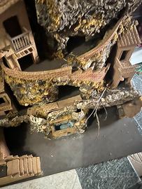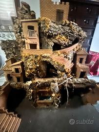 Bellissimo presepe artigianale con struttura in legno e sughero e lampioni in terracotta. Comprende le luci e una fontana funzionante con pompa elettrica tenuto in modo ottimale.
