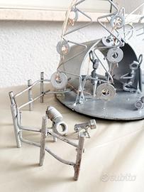 Queste opere trasformano bulloni, viti, e piccole parti meccaniche in scene di vita stilizzate e affascinanti. Il set comprende diverse figure, un albero, le basi circolari in metallo e un sistema con alimentazione a 6 pile stilo per illuminazione.